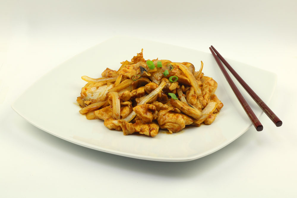 Stir-fried chicken with mushroom, onion, and sha-cha sauce.