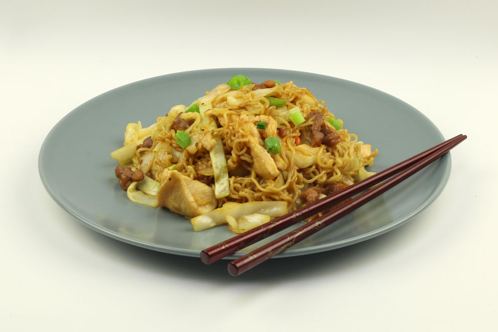 Stir-fried chinese noodles (instant noodles) with chicken, beef, shrimp and mixed vegetables (chinese cabbage, onion, zuchinni, and carrot).