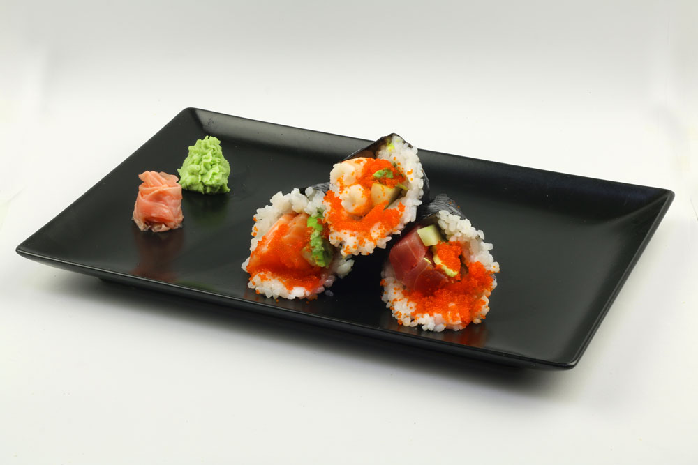 Roll de arroz sushi con atun y aguacate envuelto en alga nori